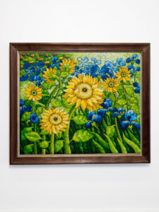 This vibrant canvas of sunflowers and blue irises was one of them. Our client wanted to keep the full edge of the stretched canvas visible while still creating a finished, structured frame.